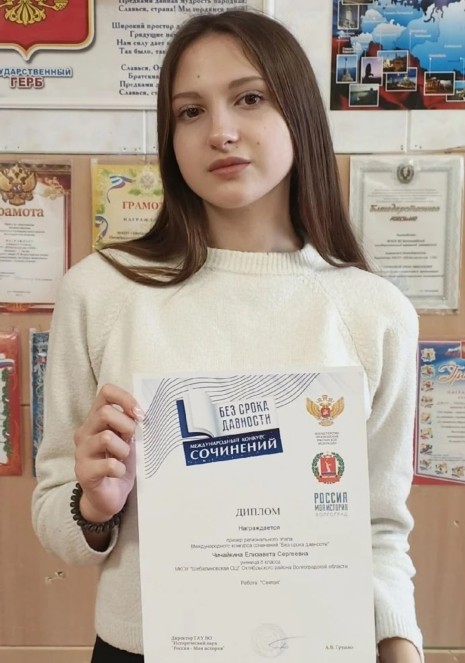- во 2-ой возрастной группе – Чичайкина Елизавета, обучающаяся 8 класса МКОУ «Шебалиновская СШ», занявшая 1 место с сочинением на тему «Святая», Шахова Анна, обучающаяся 8 класса МКОУ «Ромашкинская СШ», занявшая 2 место с сочинением на тему «Детство, разбитое войной», Шерстюгина Яна, обучающаяся 9 «а» класса МБОУ «Октябрьская СШ № 1», занявшая 3 место с сочинением на тему «Детство, украденное войной»;